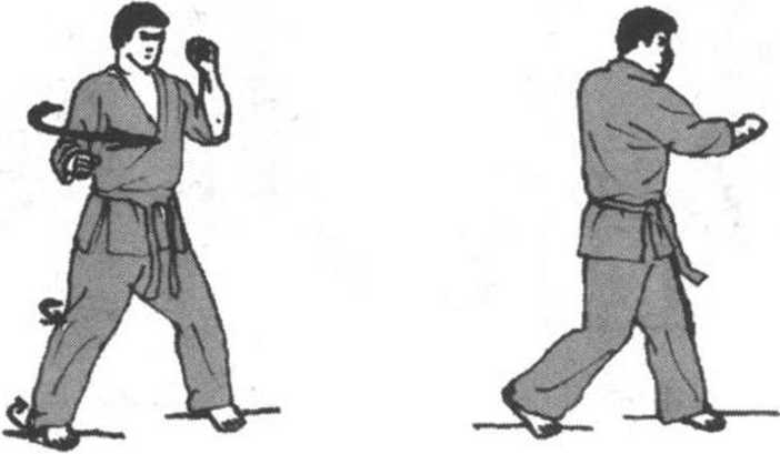 图171中段后手勾拳预势 图172中段后手勾拳完成势