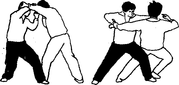 力。火焰攒心宜快宜猛。采拿跌打时进步封腿要快。 推跌时要向右侧用力,此时如能以左脚向后别靠敌 腿,则效果更佳。