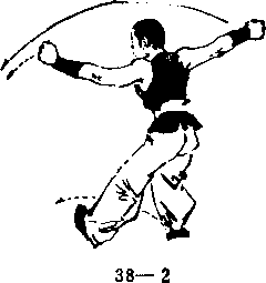 2 右脚屈膝提起,向前迈半 .步,重心移至右脚,左脚向前迈 半步,左脚跟着地,脚尖翘起, 成左翘脚步;同时,左掌变拳, 以拳面为力点,经过右臂内侧, 向前直臂冲出,高与肩平,拳心 向右。右勾手变掌,向后采搂变 拳,拳心向下,高与肩平# ?看 左拳方向_如图33—2所示。