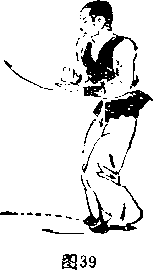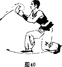 上。两手并顺式屈肘回收于腹前。眼看前方。如图39所示。 四十、跪步右推掌_螳螂拳套路基本动作