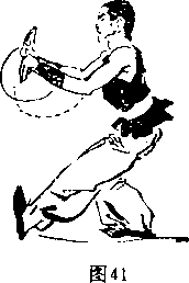 力点,向前下方推出,掌指向上,高与眼平。如图40所示。 四十一、翘脚步推掌,