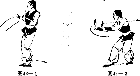 肘微屈,高与肩平,眼看前方,如图42—2所示。
