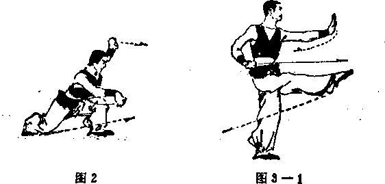 身体起立,重心移至左脚,右脚屈膝提起,以脚面 为力点伸膝向前獐踢,同时右腕外旋,变手心向上,收至右 腰倒> 左拳变掌,手心向下,在右钩手变拳回收的同时 以左拳外侧为力点经胸前和右手1上向前横推,高与胸平。如 “ 所示 ^ 接上动,右脚以脚后跟为力点,向右后方挑一步, 成左弓步,同时,左手变拳收至左腰间,右拳以拳根为力点向 前下推出,高与胸平,眼向前看。如图3—2所示。