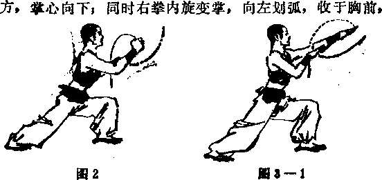 o1.上体前倾,左掌经右臂下向右、向前划孤狳于左前眼看前方,如图3 — 1所示。1.上体前倾,左掌经右臂下向右、向前划孤狳于左前2^左掌继续向左划平弧,收于胸前> 同时右掌向右划 孤抹于前方,看右掌#如图3—2所示, 左掌烃右臂上向前划孤,抹于左前方,掌心向下, 同时右掌随之向左划弧收于胸前,掌心向下,眼看左掌。如图3 —3所示 重心移至右脚,成左虚步;同时两臂屈肘|两手掌 内旋变勾手后拉,左勾顶与嘴平,右勾顶与右肩平,眼看前方。如图3 —4所示a