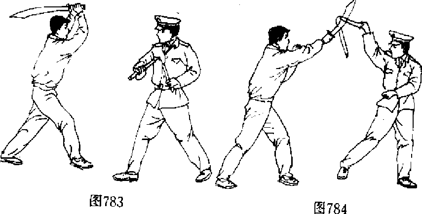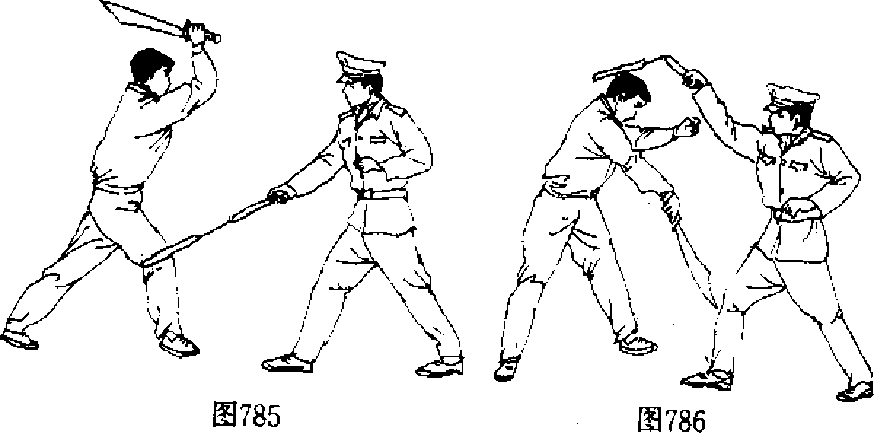 【动作说明】敌双手持单刀由上向下劈砍我头部(图 783),我立即向左侧横跨左脚,右脚同时跟进“并以右手持二 肯棍的甲棍,用甲棍近锁链处向外侧横拨其刀(图784);紧接 着我方用二节棍斜抽敌前腿膝部(图785),敌如被击中而行 动迟缓,或向后退闪,我均可抡二节棍实施第二次攻击,可击 敌头、颈、肩等部位(图786).