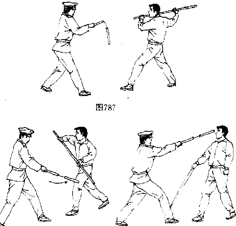 【动作说明】我右手持二节棍面对手持长棍的敌人(图 787),敌刚要以长棍劈我头顶时,我立即向前上一大步,迫近 敌身,同时用二节棍扫击故露出空当的膝盖部位(图788),无 论击中与否,我均立即将二节棍回收至左腰际,随即再次出 击,用反手弹抖的腕力再次用乙棍弹击敌面部(图789),