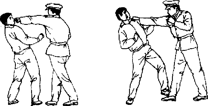【动作说明】敌我对峙,我快步向前,迅速用左拳向敌眼 部猛击(图2),如敌后仰闪防,我再上右步'用右拳击打敌喉 部(图3).
