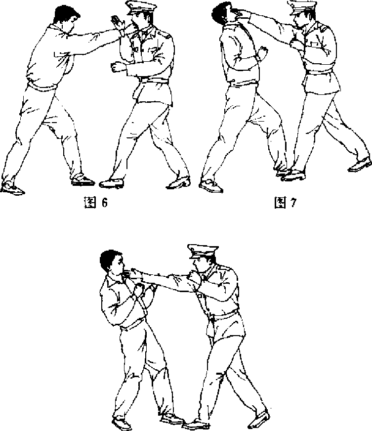 【动作说明】敌我对峙『当敌突用右拳向我眼部击来时. 我速用右掌向左砍击敌右腕臂(图6).接着,再用右掌向敌眼 部戳击(图7),然后,再用右掌插击敌喉部(图8九