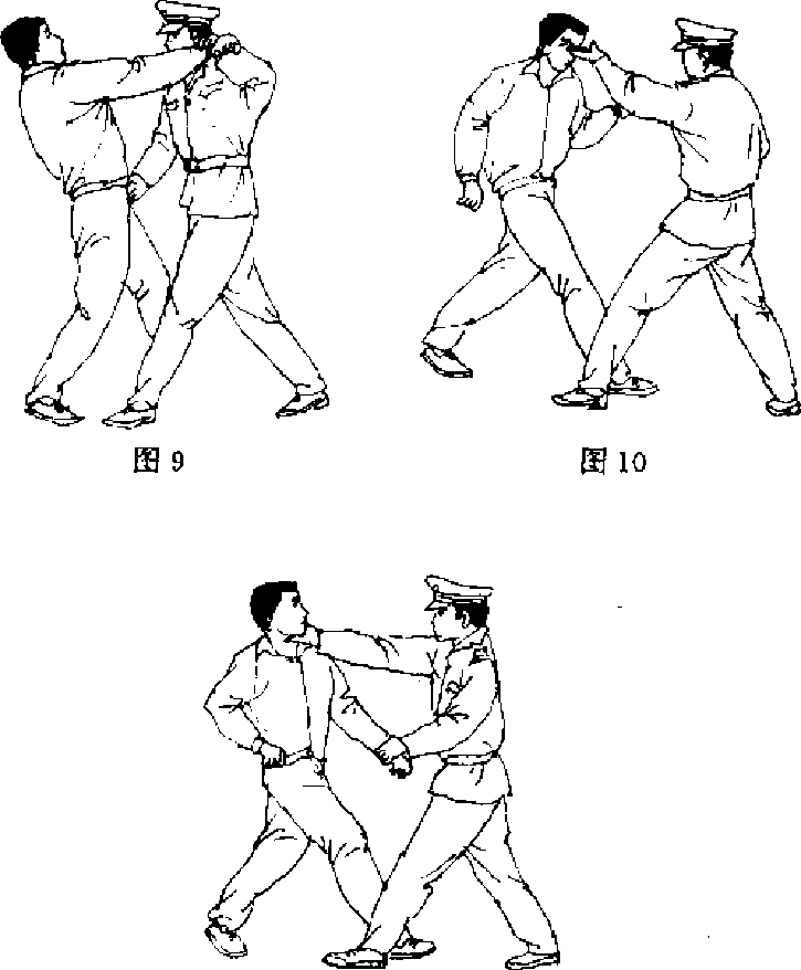 【动作说明】敌我对峙U当敌左拳虚晃,突用右拳向我眼 部击来时,我速用左手搂抓敌右乎腕(图9)。接着,速用左手 抓敌双眼(图10),然后再用右手锁掐敌喉部(图11).