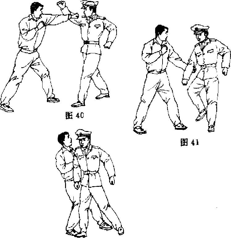 【动作说明】敌我对峙。敌左拳虚晃'突用右拳向我面部 击来(图38),我速用左手挡抓敌右拳腕,同时用右手锁掐敌 喉部,并立即用右脚踢敌档部(图39).