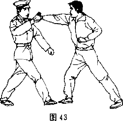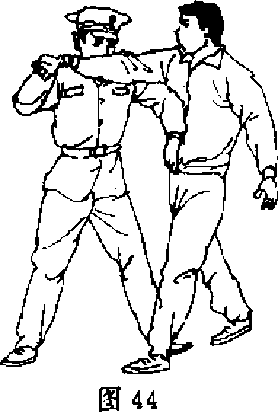 【动作说明】敌我对峙,敌右拳向我面部击来时,我速上 步左闪并同时用右手搂抓敌右腕(图43),接着用左肘击打故 心窝处,然后再用左掌向下拍击敌裆部〈图44).