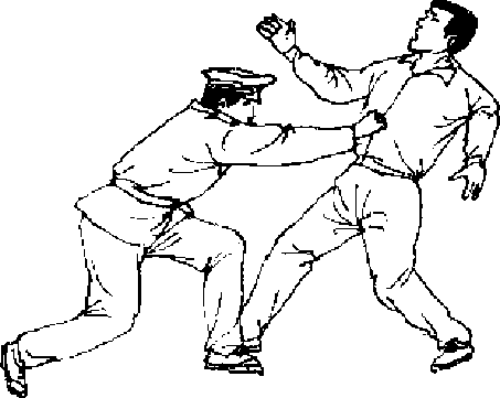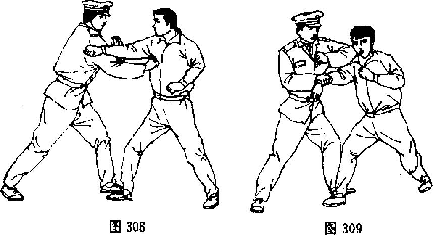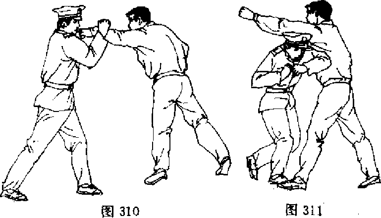 【动作说明】敌我对峙。敌眼睛视我下盘,以诱我防下, 突然进身用左拳向我面部猛击,我迅速用右手向左拍挡其左 手腕或左小臂(图310),接着,右脚稍前移,迅速屈膝下蹲,上 体右前倾,用左肘由左向右扫击敌腹(图311).然后,我左脚