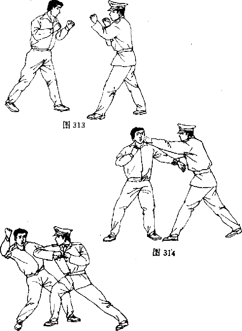 【动作说明】敌我对峙,敌突然向前滑步、并同时用左拳 向我面部击来(图313),我速上左步,并同时用右手挡抓敌左 腕,出左拳击打敌面眼部(图314).接着我右脚上步坐身成弓 步,同时用右肘顶击敌心窝处(图315儿