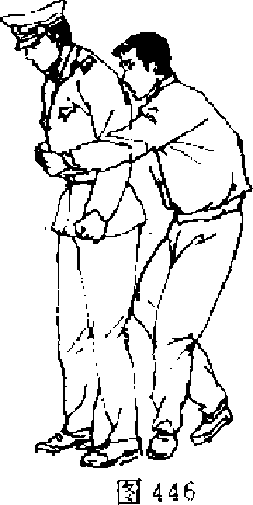 【动作说明】敌从后面抱住我腰部,我迅速降低重心,用 右脚猛力踏踩敌右脚面「同时向左后碾转(图446),当敌向后 抽腿时,我速用右后拐肘攻击敌右侧头部(图447)o