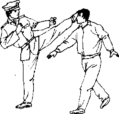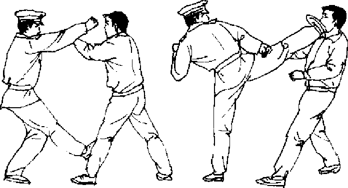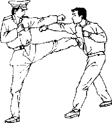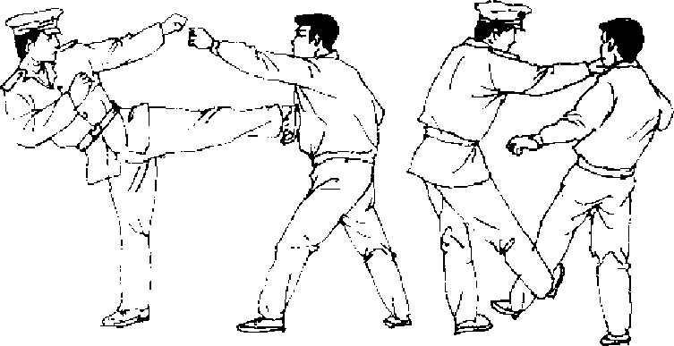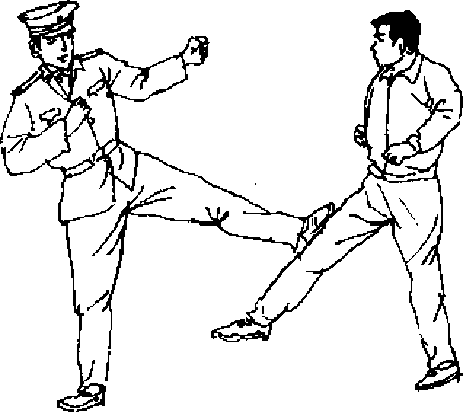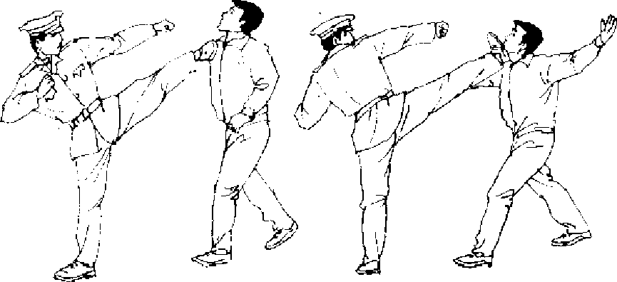 【动作说明】敌我对峙,当敌突然用右直拳向我头部击 来时,我上体后闪避敌拳锋,同时速起左腿踹击敌右肋部〔图