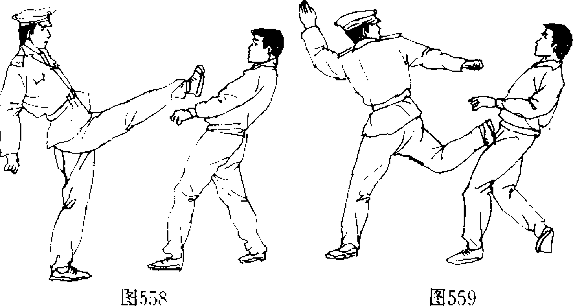 558) ,当敌后仰身时,我迅速向左后转体,同时用右脚撩击敌 裆部(图559).