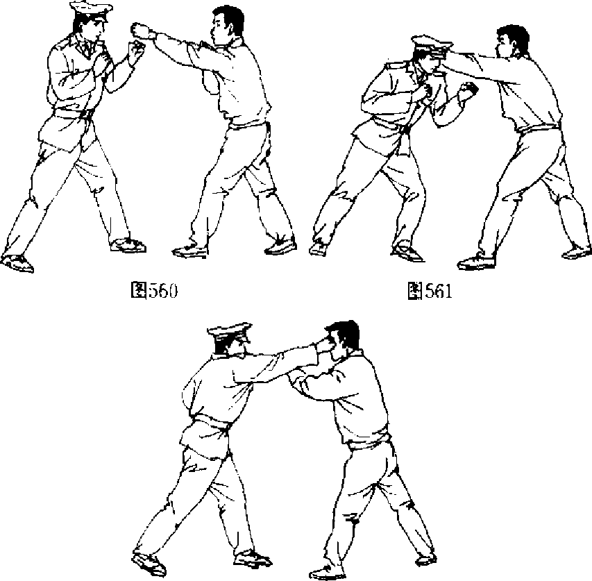 【动作说明】敌我对畤。敌突然上步以左直拳向我攻来 (图560),我速向右滑步侧闪,避开敌进攻(图561).接着我用 右摆拳反击敌头部左侧(图562),使敌被击伤,