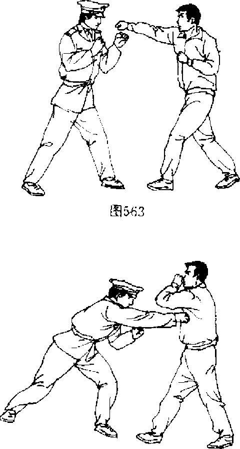 【动作说明】敌我对峙,当敌用右直拳向我头部击来时 (图563),我身体下俯,使敌拳落空,接着顺势用右直拳击打 敌腹部(图564) 口