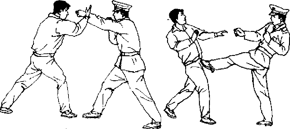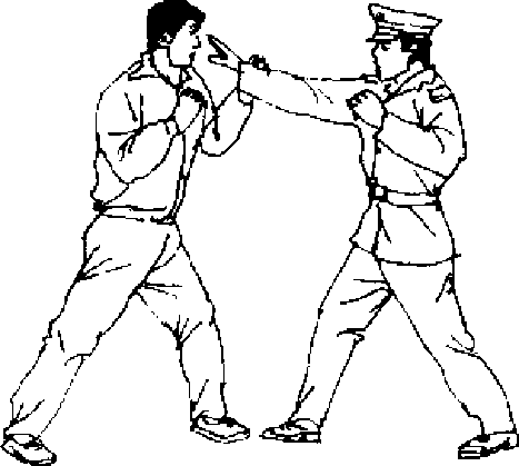 【动作说明】敌我对峙.敌两手护于胸前,我突然向前, 用右爪抓击敌面眼部,敌用左掌向右拍击我右小臂(图462)* 我速上右步并用左探爪抓击敌面眼部,当敌欲用右掌向左拍 击我左小臂时(图463),我迅速将双手回收,同时用左腿弹踢 敌裆部(图464)口