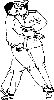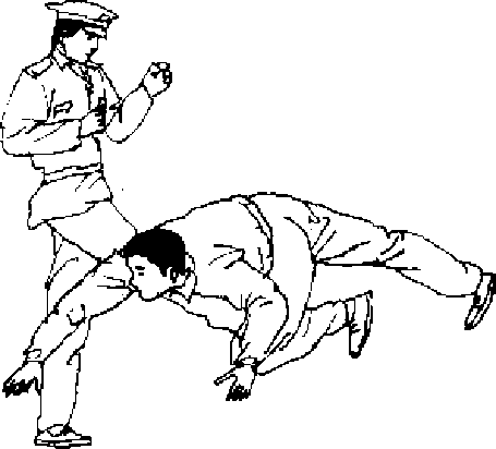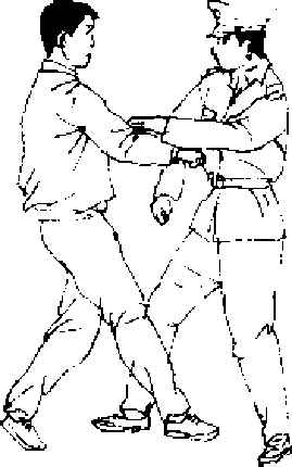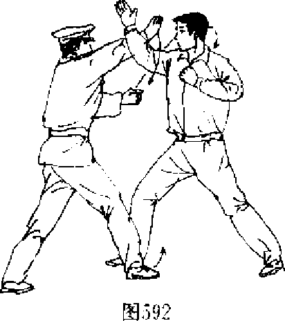 【动作说明】敌我对峙■敌用右拳向我头部击来,我速用 左手从上往下按压敌臂(图597),随即上右脚,落于敌右脚 后,同时以右手、'臂、肩撞击敌中线[图598),使敌向后倾跌。