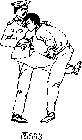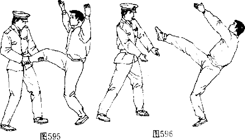 【动作说明】 敌我对峙。敌突然用右掌由上而下向我头 部劈击时,我速起右手臂上迎(图592,一旦粘接即向右后下 捋带,使敌身前倾失势.同时起前脚向敌右后勾踢其右腿,并 右转身用左掌拍打其后背(图593),手脚合劲,使敌向我右侧 跌出(图594).