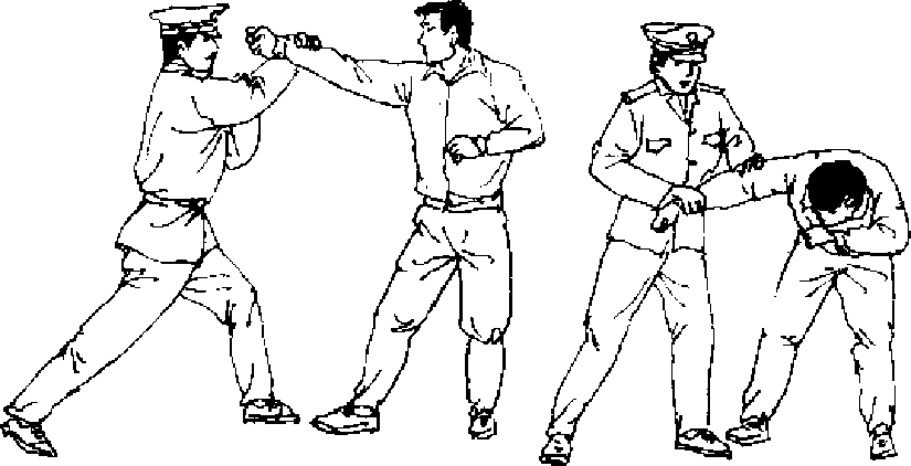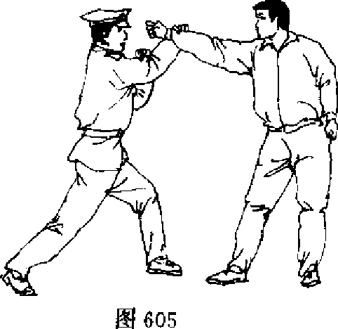 【动作说明】敌我对峙。敌左拳虚晃,突然用右拳向我面 部击来时,我速向左前方上孝闪避*同时用右手抓拿锁扣敌右 腕脉门(图605九接着,速用左手向上猛力托击敌右肘关节* 右手扣腕下抖(图6。6)'使敌筋断骨折。