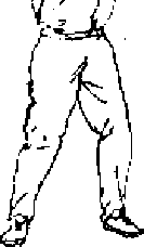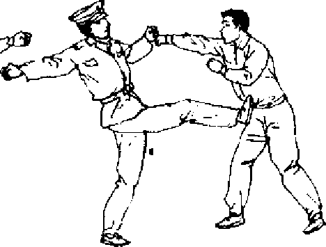 1-甲乙二敌从侧面同时挥拳向我进逼时,我重心迅速右 移,左脚向右侧插步、屈膝、五fit抓地,同时,上体稍仰*避敌攻 势,右脚屈膝提起弹击甲敌腹裆(图630).