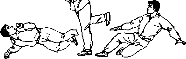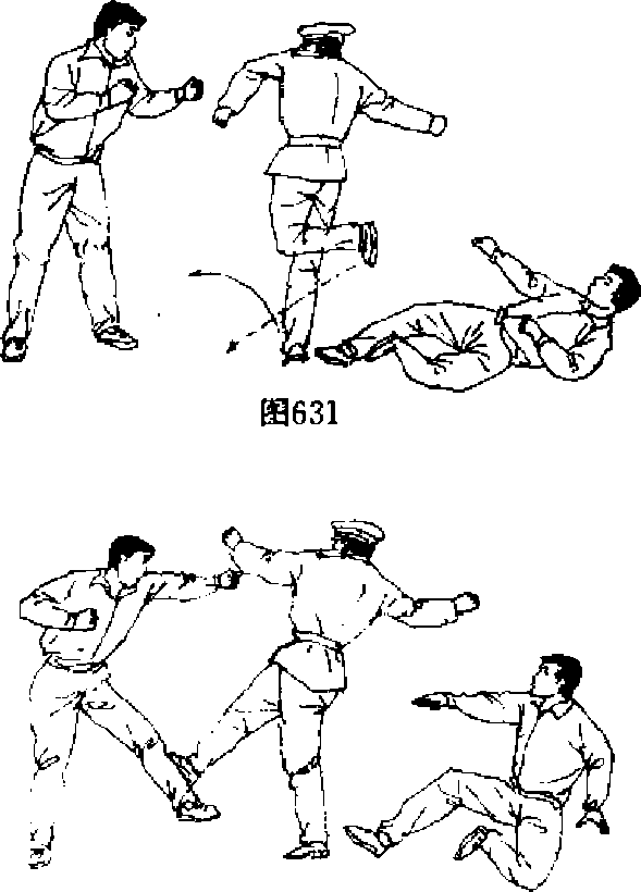 2. 我右腿将敌踢倒后,迅速回收落地转身,左腿同时提 起向前跳步,靠近乙敌,左拳虚击其面,诱其上防,然后'借势 起右脚踩踏其胫骨(图631、图632),