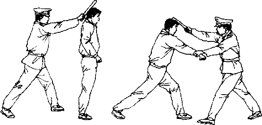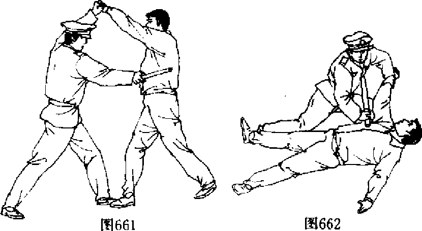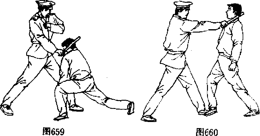 可用短棍横扫、劈砸敌之颈部,用力过重会使敌出现昏迷 (图 660).