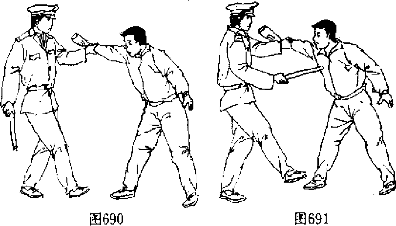 【动作说明】当敌右手抓起酒瓶从上至下向我头部砸来 时,我左手迅速向前上方抓住敌有腕(图69。)*然后立即用短 棍点击敌肋部(图691).