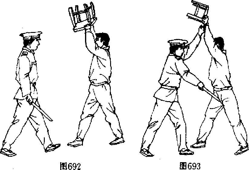 【动作说明】当敌突然用右手举凳欲向我头部砸击时 (图692),我迅速用左手向上抓挡,紧接着右手持棍点击敌腹 部(图693) o