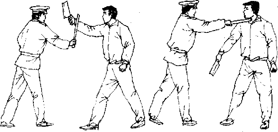 【动作说明】当敌右手握菜刀向我头部劈砍时,我迅速 用短棍向左拨打敌左手腕(图694),紧接着,再用短棍击点敌 下颌处(图695"