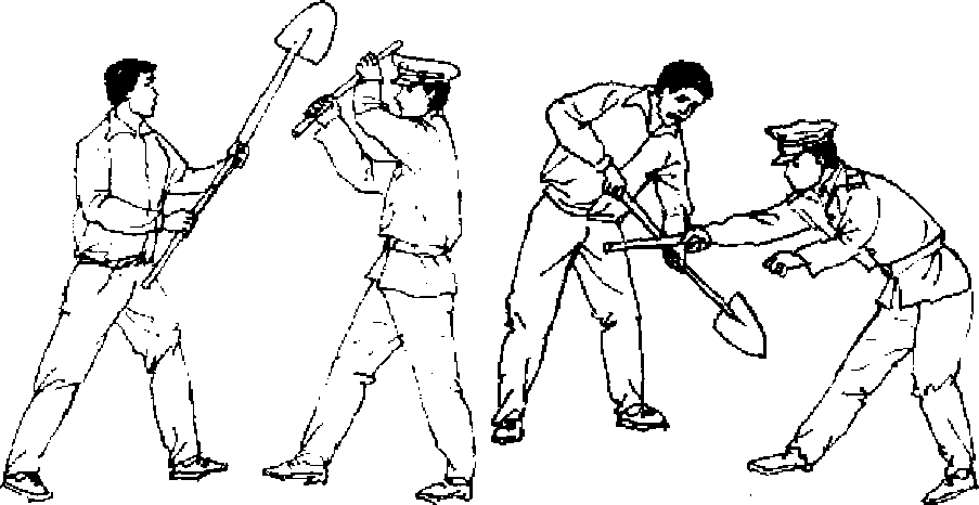 【动作说明】当敌双手拿铁锹,由上至下向我头部劈打 时,我用两手持短棍上架防守(图696),紧接着,我右手持棍 向敌挡部戳击(图697九