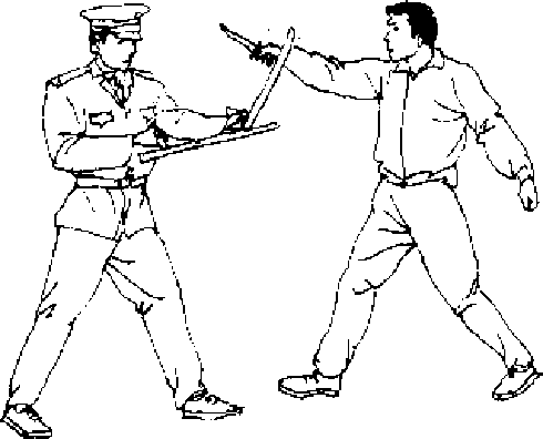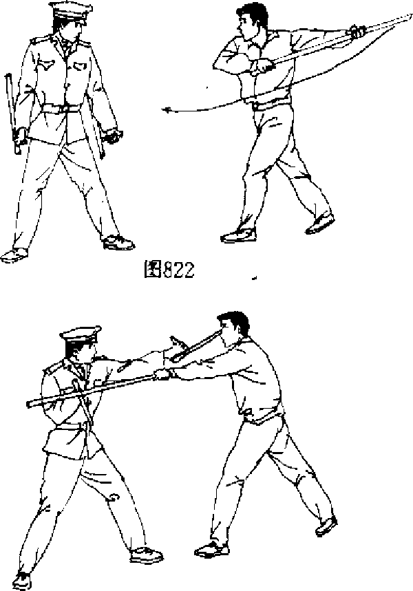 (一)右格左戳【动作说明】我持双拐对敌,当敌双手握长棍由左向右 向我中上盘扫击时(图822),我迅速右手持拐格挡敌长棍,同 左手持拐向敌面部戳击(图823"(二)击臂点心【动作说明】敌右手持匕首向我刺来,我双手持拐应敌 (图824),我迅速用左手持拐击打敌持匕右腕,紧接着用右手 拐点击敌心窝(图825k图824第五章搏杀功夫秘传修炼法