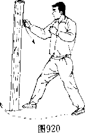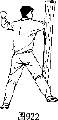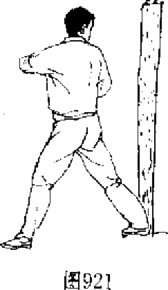 【动作说明】上动稍停,左脚上步,身体自右向后稍转, 同时,右臂屈肘握拳,用右肘横击木桩,力达肘尖,目视肘臂 (图 921、图 922"