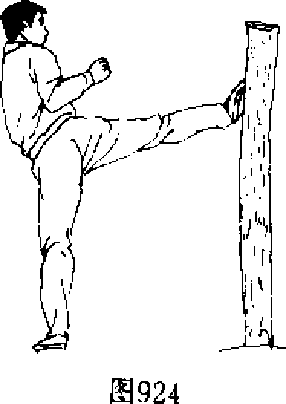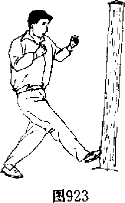 【动作说明】接上势,右脚提起,脚尖外展.同时,用脚掌 向前下方踩击木桩,脚高与膝平,两臂屈肘抱拳,目视前方(图 923),