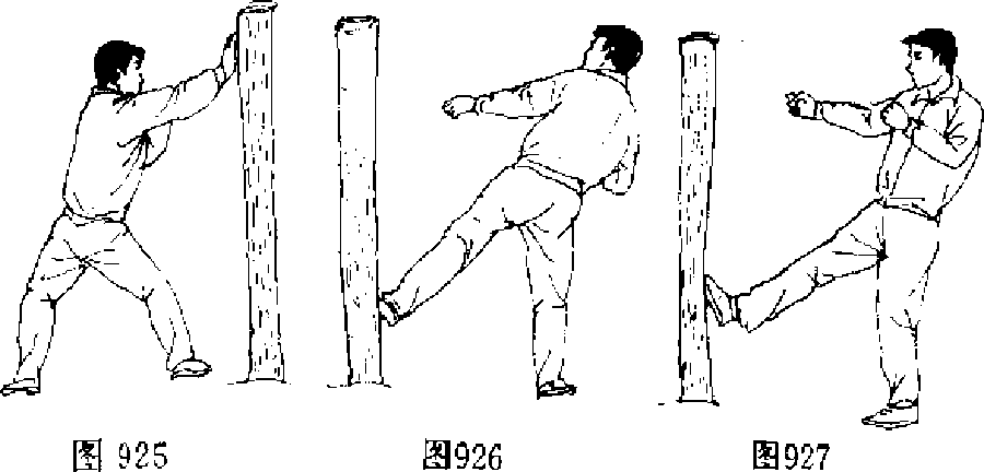 L上动不停,上体右转180。略后仰,左掌经胸前划弧按 于胯前,同时左脚踹击木桩,高于膝平,目视左脚(图926).