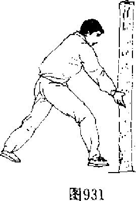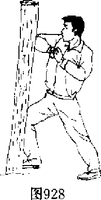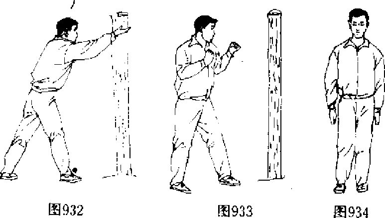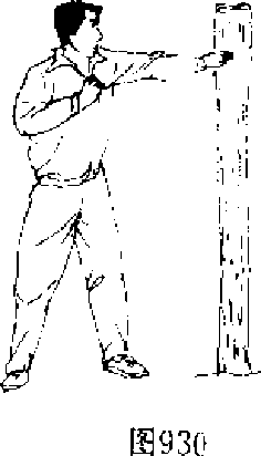 【动作说明】上动不停,身体左转,右臂外旋,以小指一 侧为力点,向左前侧劈击木桩,左掌收于面前,目视右手(图 932九