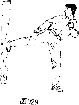 【动作说明】上动不停,身体左转45。,同时有脚顺势提 起?由下向后上方撩踢桩木。右拳变掌向后自然摆动,左拳收 于左颌上方,目视右脚(图929九