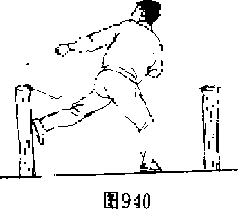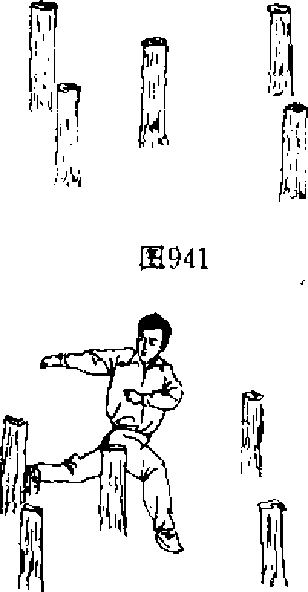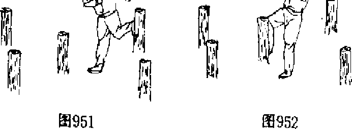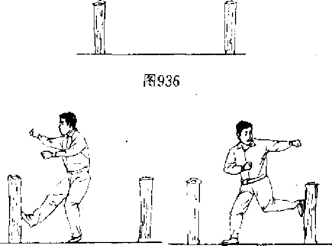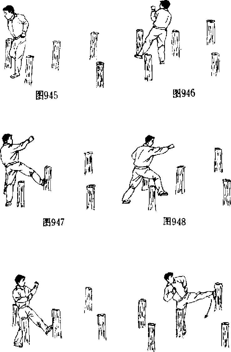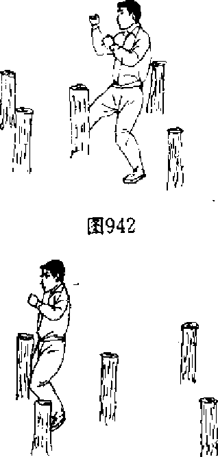 用两根高于膝部或裆部的圆木,按约两步远的距离埋好 (图936)■该桩主要练习前后翻转的连环腿法。练习时可站立 两桩中间,也可靠近某一个桩子站立口如先用右直丁腿踢桩, 再用左蹶腿踢桩,再接右拐腿踢桩,向左后转体,顺势用左腿 继续踢桩(图937、图93&图939、图940)「紧接此势用左直丁 腿踢桩重复以上动作,可左右反复练习.