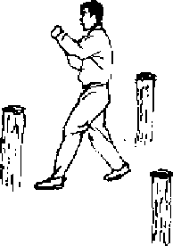 该桩主要练习前后左右多种变化的连环腿法,还可以运 用相应的步法来调整距离和方位,练习时,从哪个桩子踢起都 可以。下面介绍的是先从中间的桩子开始踢起.如先用右斜