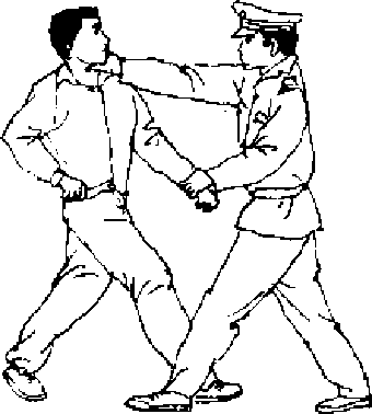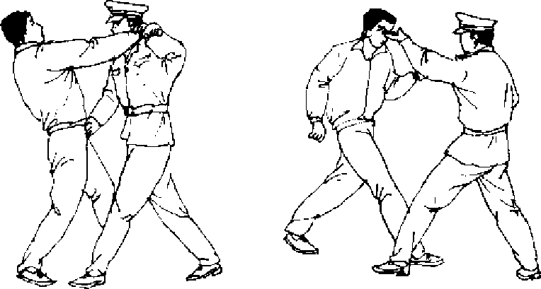 【动作要领】我田后接近敌方要快速、突然,锁喉抠眼要 同时进行.锁喉不要用肘弯部,因为肘弯部留有空隙,不能迅 速有力地制敌,