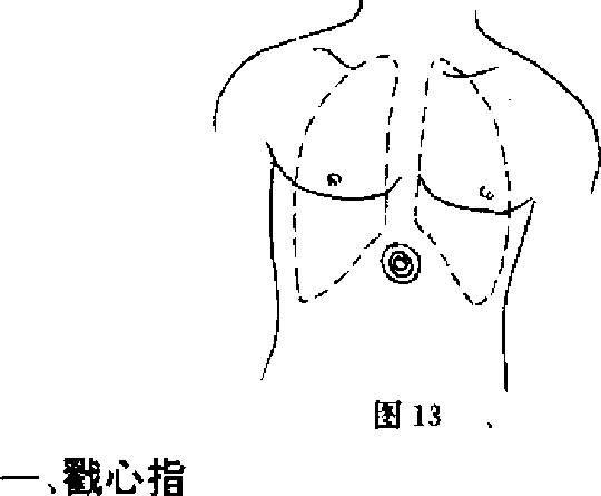 心窝,即胸骨剑突部位(图13),属人体死穴,击打此处, 因剑突后的内脏器官有心脏下部(芯室),下缘正好是肝与胄 的重叠处,而剑突是软骨组织,此处又无肋骨保护脏器,所以 可直接震荡心脏,剌激膈肌与下位肋间神经,使人心闷,呼吸 困难,腹壁剧烈疼痛丧失抵抗能力。严重者可震颤心脏,使肝 脏破裂,或当场死亡。所以,平时切磋一般不打此处'非到与凶 残歹徒生死搏杀时才可击打.下面分指、掌、拳、肘、膝、腿等6 个方面来介绍攻心技法的具体运用.