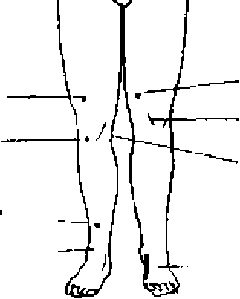 按一般惯例,人体下盘通常是指档部以下各部位■裆都是 人体最薄弱的部位,前面已有论述;其次是膝关节,由于受前 后交叉韧带的限制,膝关节不能外展、内收,暴力击打可使膝 盖骨粉碎而失去反抗能力;再就是胫骨部,粗大成棱状*皮薄 肉少,如从正面踢铲击'疼痛难忍;膝下面是踝关节及脚趾骨, 如用力拧转和暴力击打,会使其脱臼,疼痛难忍。下盘要穴如 (图52)所示。
