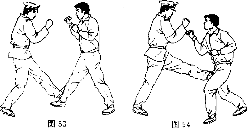 左脚踢敌前腿胫骨(图53),脚不落地,再蹬击敌裆部(图54).