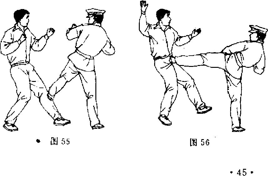 【动作说明】我先用左拳虚晃敌面部,接着用左脚蹬击 敌膝部(图55),然后再用左脚向敌挡部猛踹(图56).