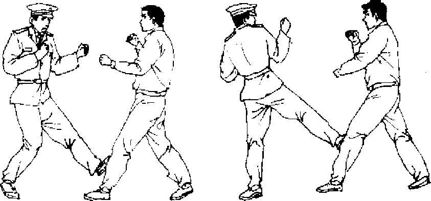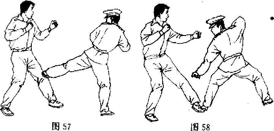 【动作说明】敌我对峙■我用拳向敌面虚晃,吸引其注意 力,再迅速右转身,并用左脚踹敌前腿膝部(图57),然后势 下碾搓敌脚面〔图58)。