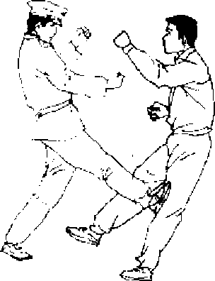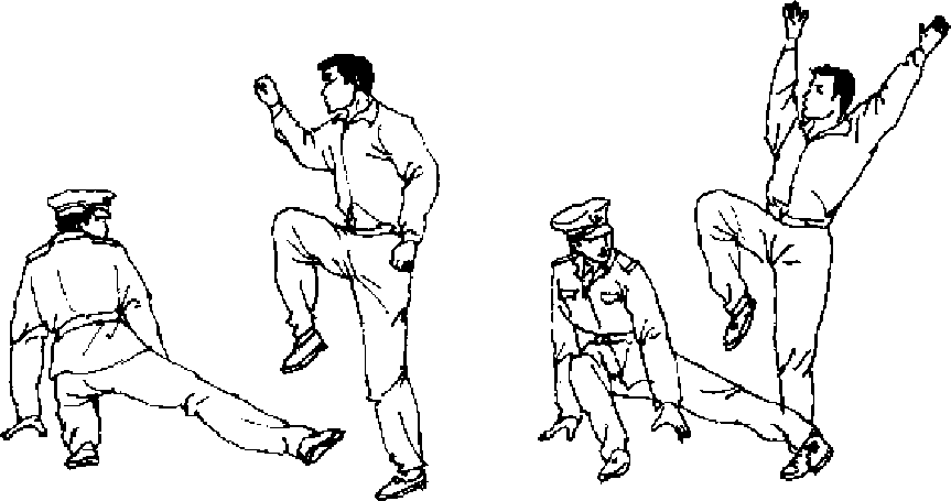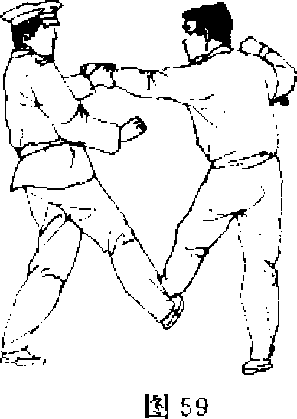 【动作说明】 敌我对峙■敌用左拳击我面部,我速用左手 搂抓敌左腕部,并用右脚勾踢敌左脚跟(图59),脚不落地顺 势下铲敌支撑腿膝部内侧(图60).