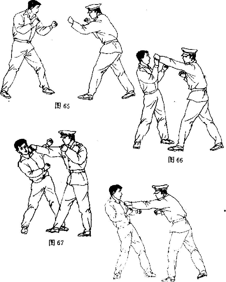 【动作说明】双方成格斗势(图65)『我向前进步以左直 拳攻击敌面部,敌如以右手拨防(图66),我立即上右步以右 拳摆击敌左侧太阳穴(图67、接着再以左直拳连击敌中盘部 位(图68).