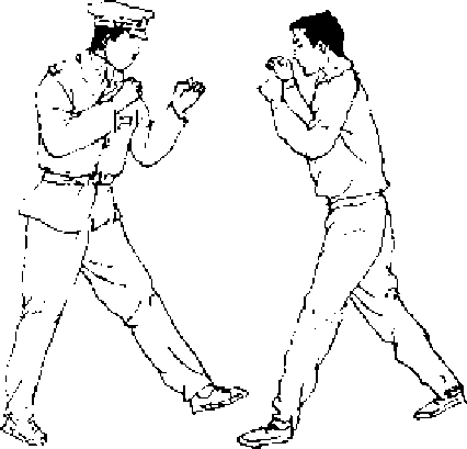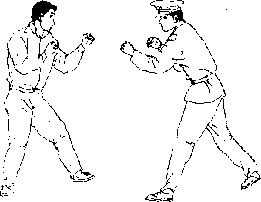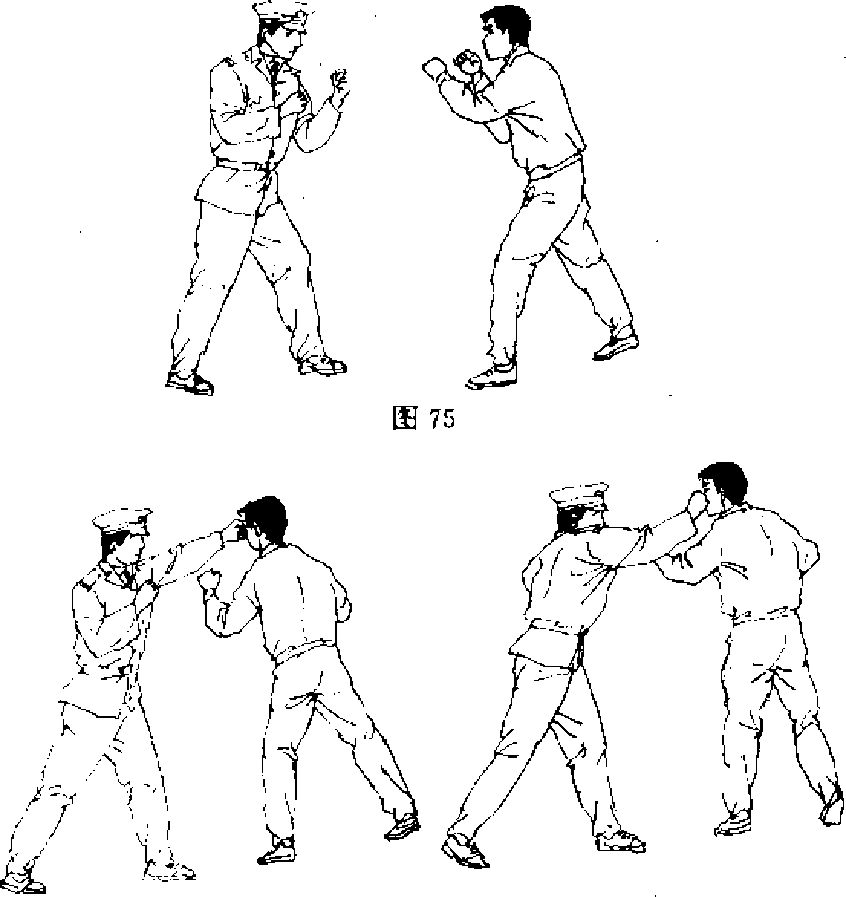 【动作说朗】 双方成格斗势(图75) ,我向前进步?同时 用左直拳击打敌面部(图76)*接着再用右直拳击打敌面部 (图 77"